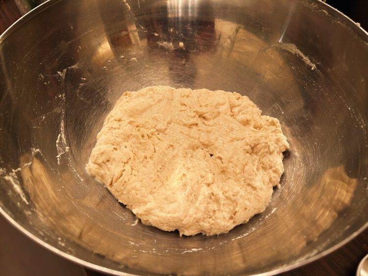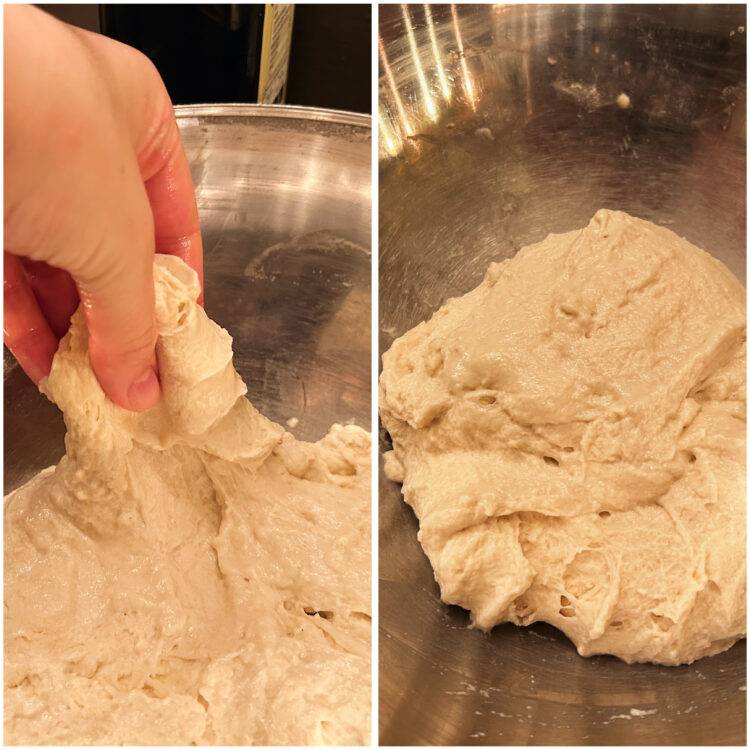 - Nach 10 Minuten den Handtuch abnehmen und mit befeuchten Händen nimm eine Handvoll Teig von der 12-Uhr-Position, zieh ihn leicht nach oben und dann über den Großteil des Teigs zur 6-Uhr-Position. Wiederhol das auf allen Seiten des Teigs, bis es sich so anfühlt, als hättest du etwas Spannung erzeugt und du den Teig nicht mehr weiter nach oben ziehen kannst. Er sollte sich zu einer groben Kugel straffen. Bedecke den Teig mit einem Handtuch. Nach weiteren 10 Minuten das gleiche wiederholen. Dieses Mal soll der Teig viel elastischer sein. Die Schüssel mit einer Frischhaltefolie bedecken und für mindestens 24 Stunden (am besten 48Std) in den Kühlschank ruhen lassen.